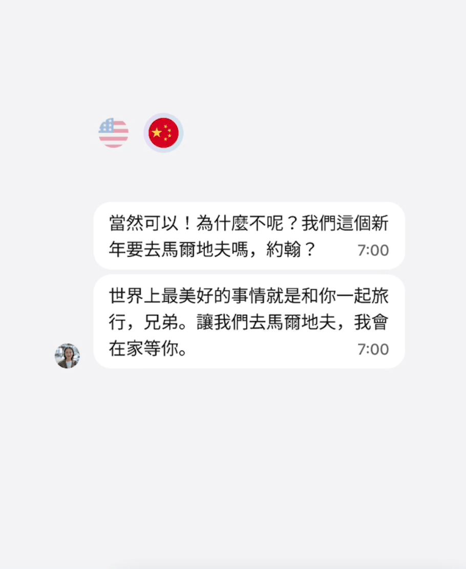 Real connection without barriers: speak naturally, see everything translated in real time, and learn by exploring your partner’s original language in every conversation.